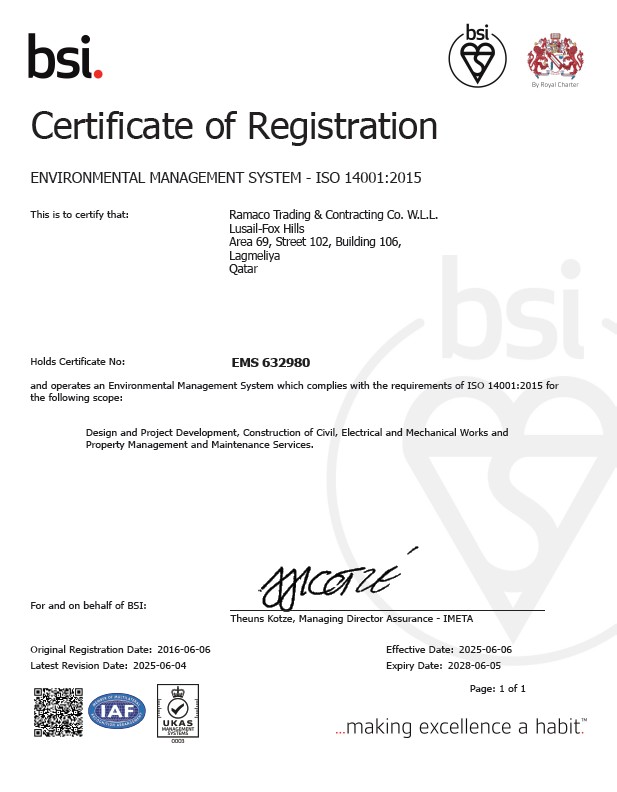 RAMACO Trading & Contracting is proud to announce that it is now certified as an ISO 14001:2015 Environmental Management System - (EMS) compliant organization.